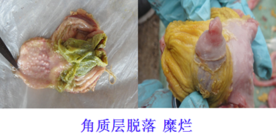 谷鳳柱教授稱,正因?yàn)樯鲜雒咕懊咕舅責(zé)o處不在的特性,所以只要是雞群能夠接觸到的地方,如:飼料、飲水、環(huán)境、網(wǎng)盤、墊料、粉塵等都有它們的存在。最常見又直觀的是它們對雞的內(nèi)臟器官的損傷,如:腺胃壁腫脹與水腫,有彈性并外翻,嚴(yán)重時粘膜糜爛;若偶有腺胃壁松弛,則多見為嘔吐毒素侵害所致;若腺胃乳頭消失,以致壞死崩解變薄,則多為嘔吐毒素+T2毒素共同導(dǎo)致的。下面是谷教授給我們分享的部分病理解剖圖片: